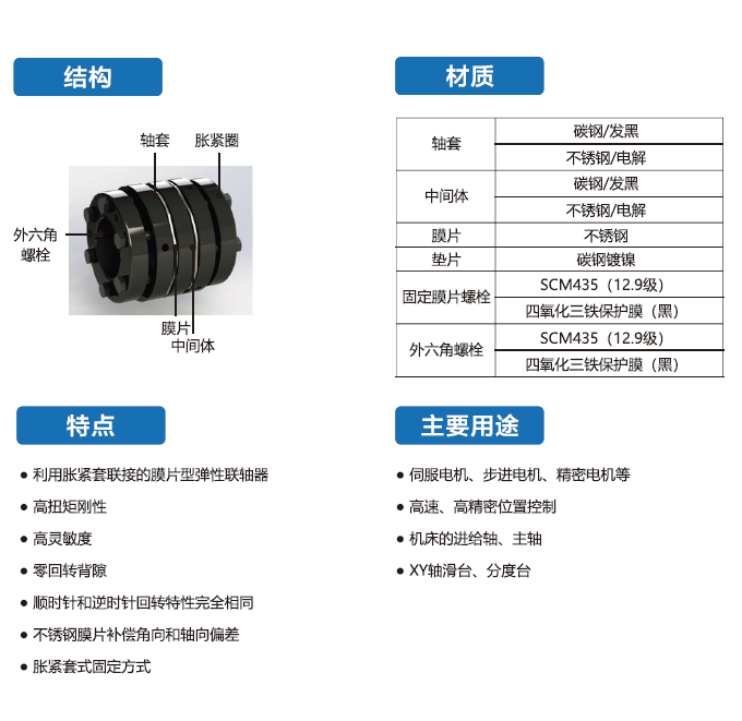 HSFPS-T系列聯軸器采用碳鋼發黑,利用脹緊套聯接的膜片型彈性聯軸器,廣泛用于伺服電機、步進電機、精密電機等。
